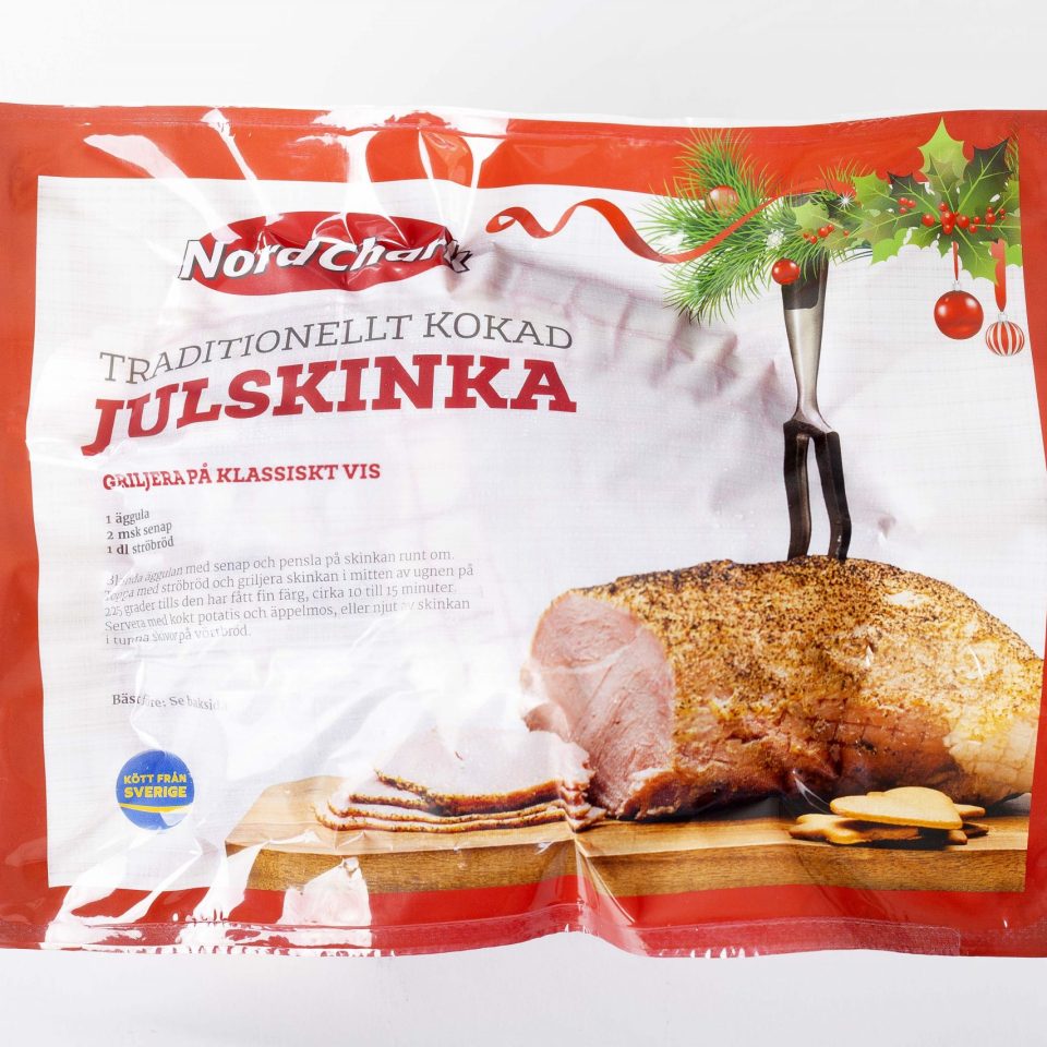 Ingredienser: Skinka av gris* (85%), vatten*, salt, stabiliseringsmedel E451, antioxidationsmedel E301/E331, druvsocker (majs), konserveringsmedel E250. Skinkspad c:a 6%.
