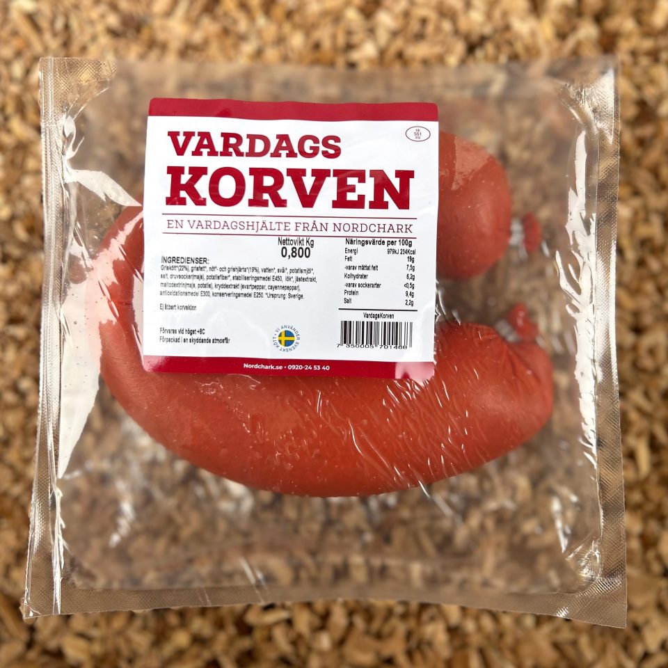 Ingredienser: Griskött*(22%), grisfett*, nöt*- och grishjärta*(19%), vatten*, svål*, potatismjöl*, salt, druvsocker(majs), potatisfiber*, stabiliseringsmedel E450, lök*, jästextrakt, maltodextrin(majs, potatis), kryddextrakt (svartpeppar, cayennepeppar), antioxidationsmedel E300, konserveringsmedel E250. *Ursprung: Sverige.
